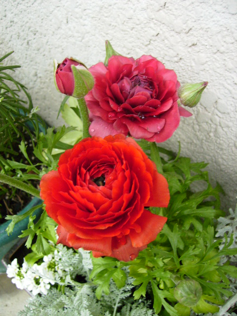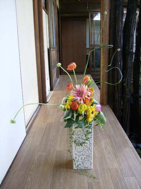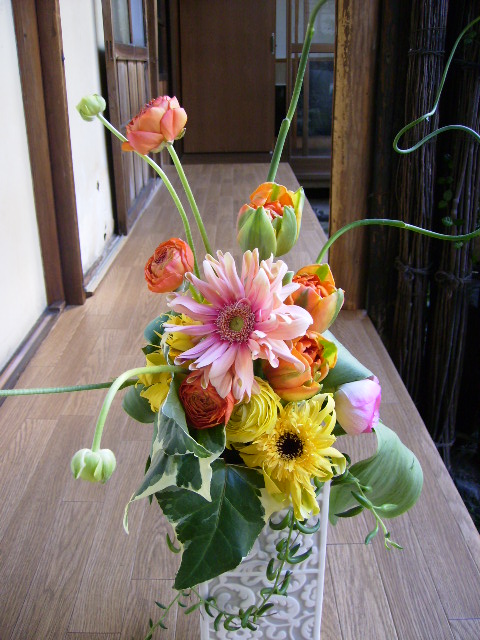 大輪のガーベラ、ラナンキュラス、チューリップ、