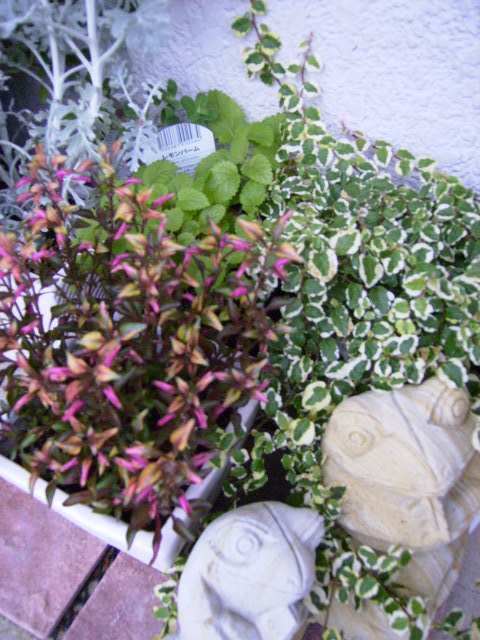プミラの左奥は『レモンバーム』で、手前がアキランサスです。