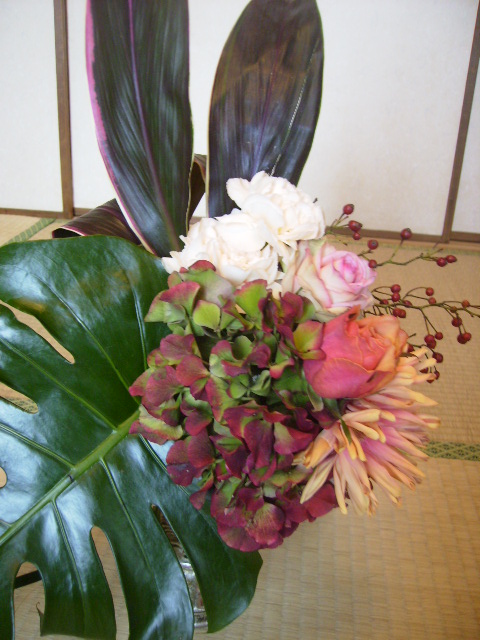 今月のアレンジメントは私の好きな”モンステラ”を使ったアレンジ。